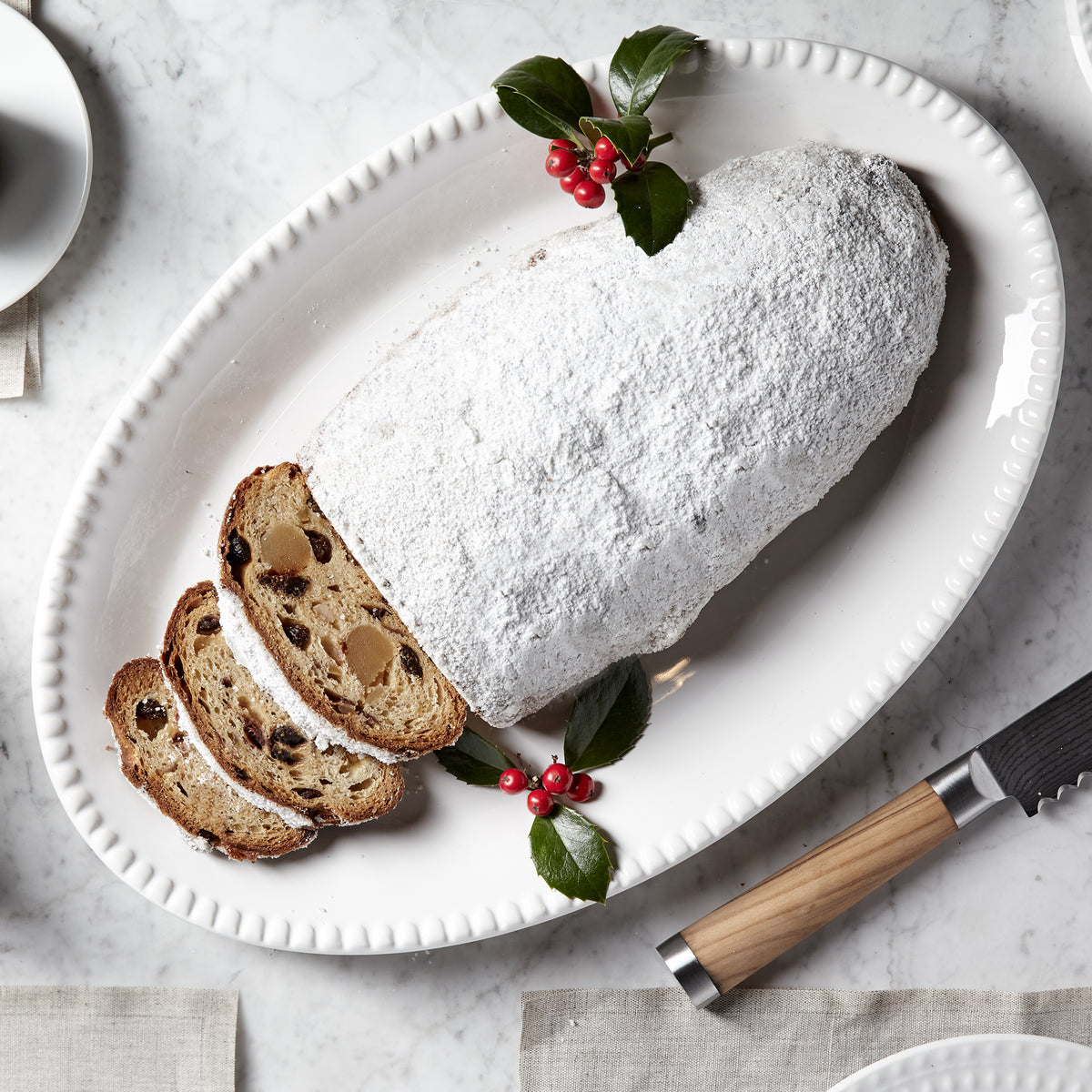 Our version of the beloved German holiday bread is filled with marzipan ropes, house made candied Meyer lemon, and black mission figs. Each loaf is bathed in buttered rum and coated in vanilla bean sugar, then